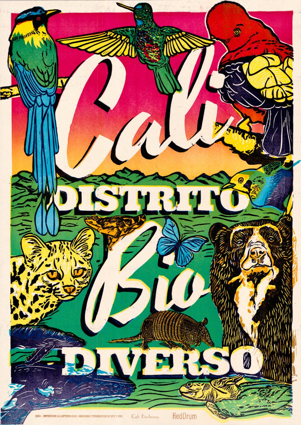 Cartel impreso en papel Earth Pact de 150 gramos, tallado sobre linóleo, por «Artistas Residentes» e impreso en maquinas de los años 1870 y 1890.