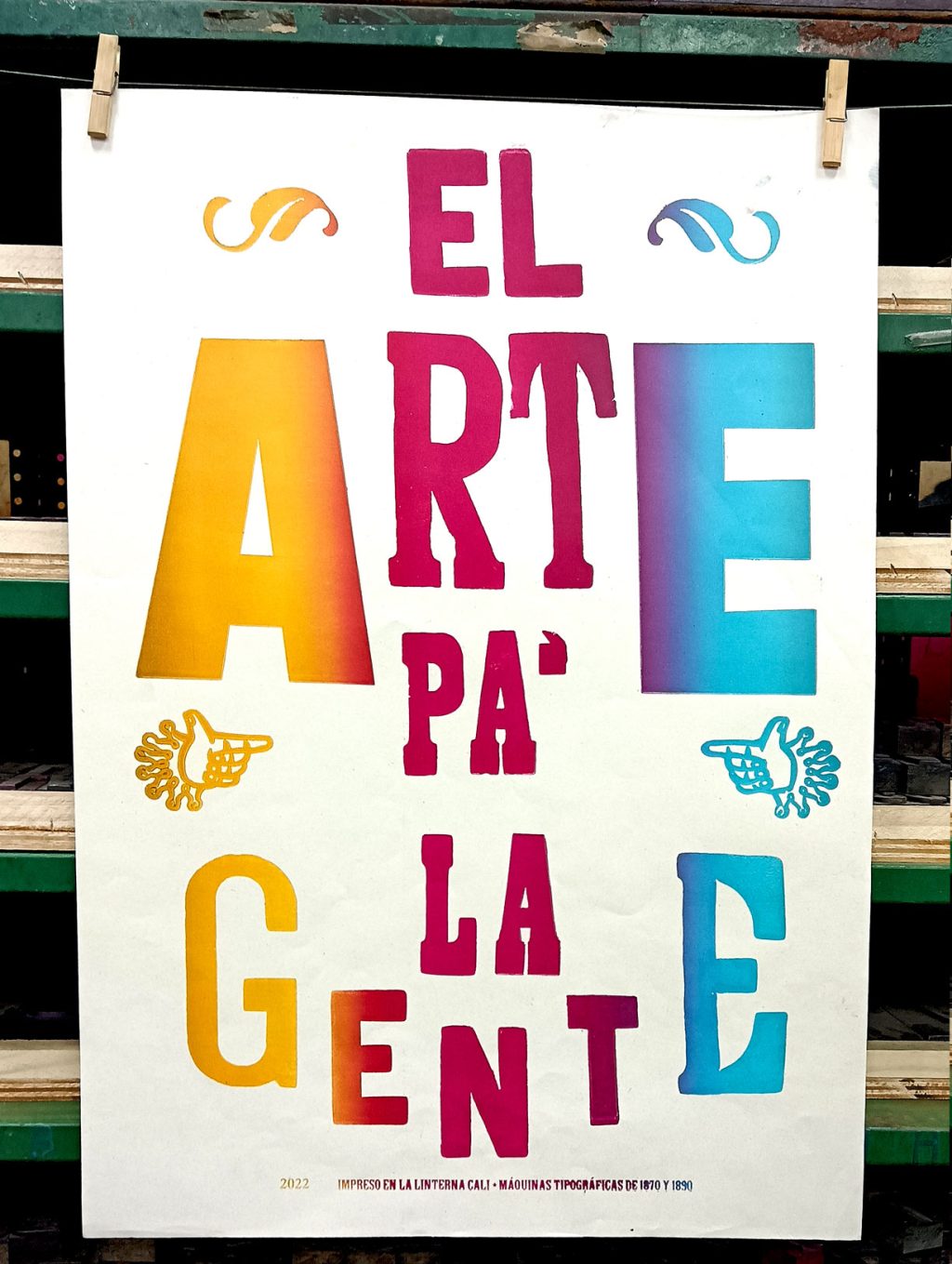 Cartel impreso en papel Earth Pact de 150 gramos, tallado sobre linóleo, por «Artistas Residentes» e impreso en maquinas de los años 1870 y 1890.