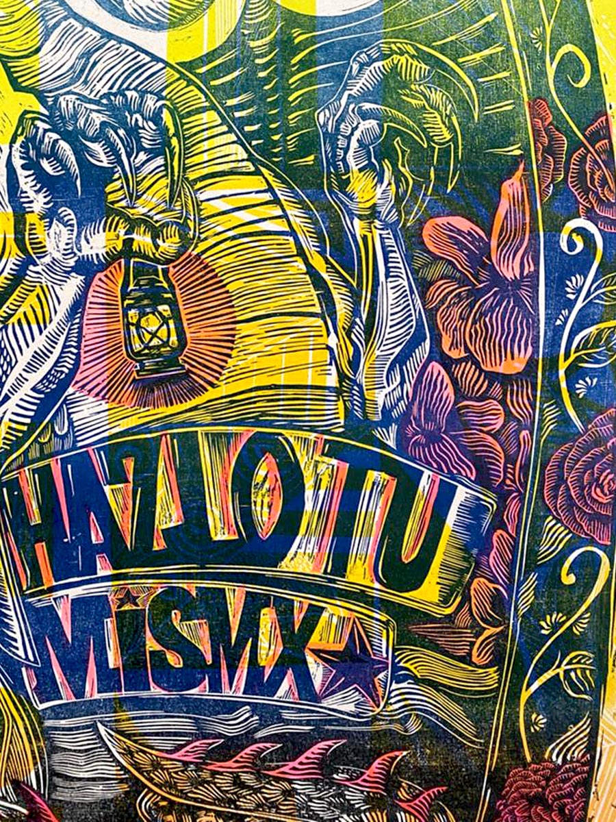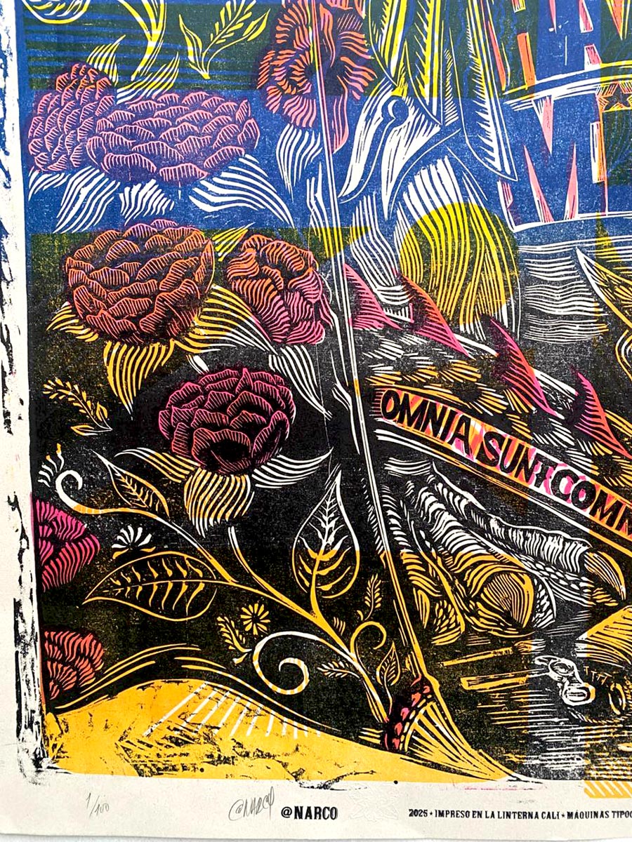 Cartel impreso en papel Earth Pact de 150 gramos, tallado sobre linóleo, por «Artistas Residentes» e impreso en maquinas de los años 1870 y 1890.